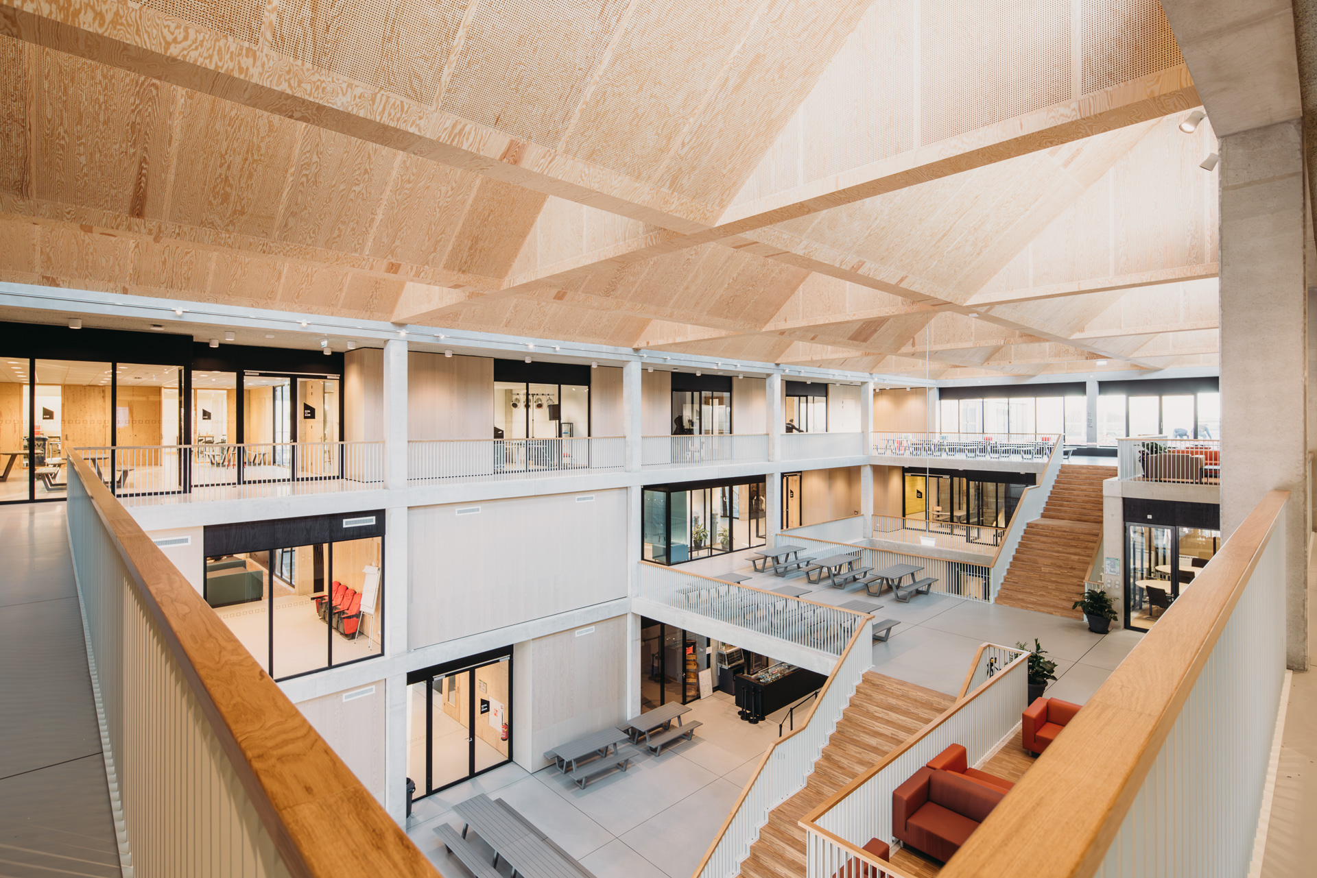 Het nieuwe gebouw omvat verschillende clubhuizen. Elk clubhuis biedt leerpleinen, praktijkruimten en leslokalen die naadloos aansluiten op de specifieke vakgebieden en onderwijsdoelen. Elke leerling en docent maakt deel uit van een specifiek clubhuis en zorgt voor gemeenschap en betrokkenheid. Deze aanpak minimaliseert onrust en versterkt de binding tussen leerlingen en hun omgeving. Het centrale atrium, met terrassen in de algemene ruimten, stimuleert interactie en samenwerking tussen leerlingen.