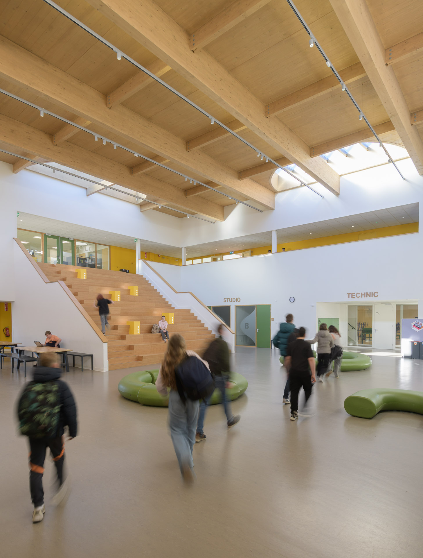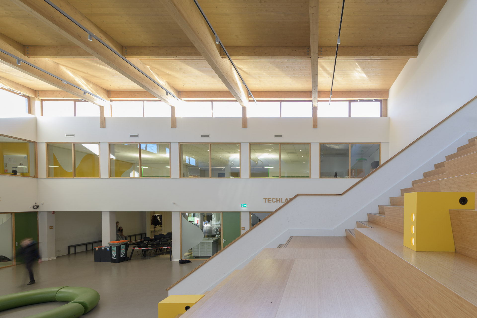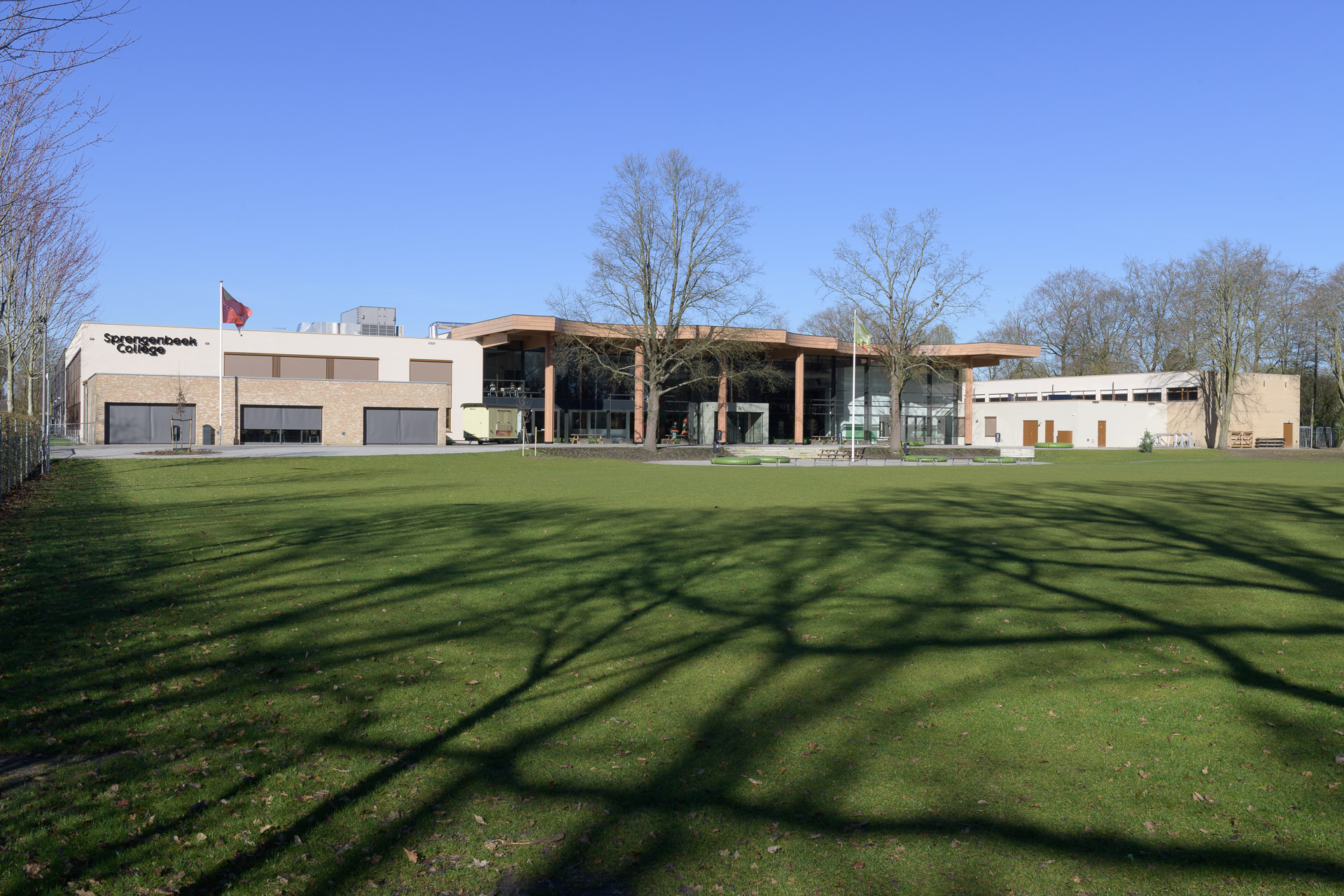 Het Sprengenbeek College is volledig gasloos, opgebouwd met CLT, zelfs in het dak, en voldoet aan Frisse Scholen Klasse B. Het resultaat is een duurzame en toekomstbestendige school waar leerlingen en medewerkers comfortabel kunnen leren en werken.