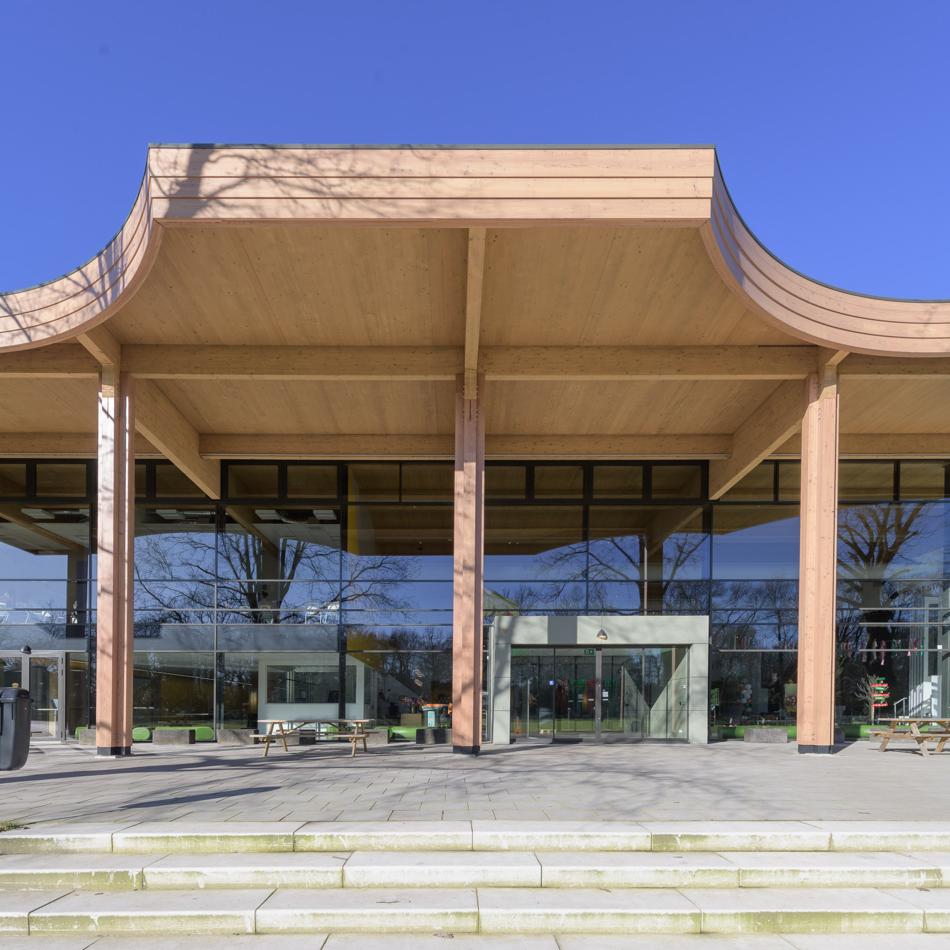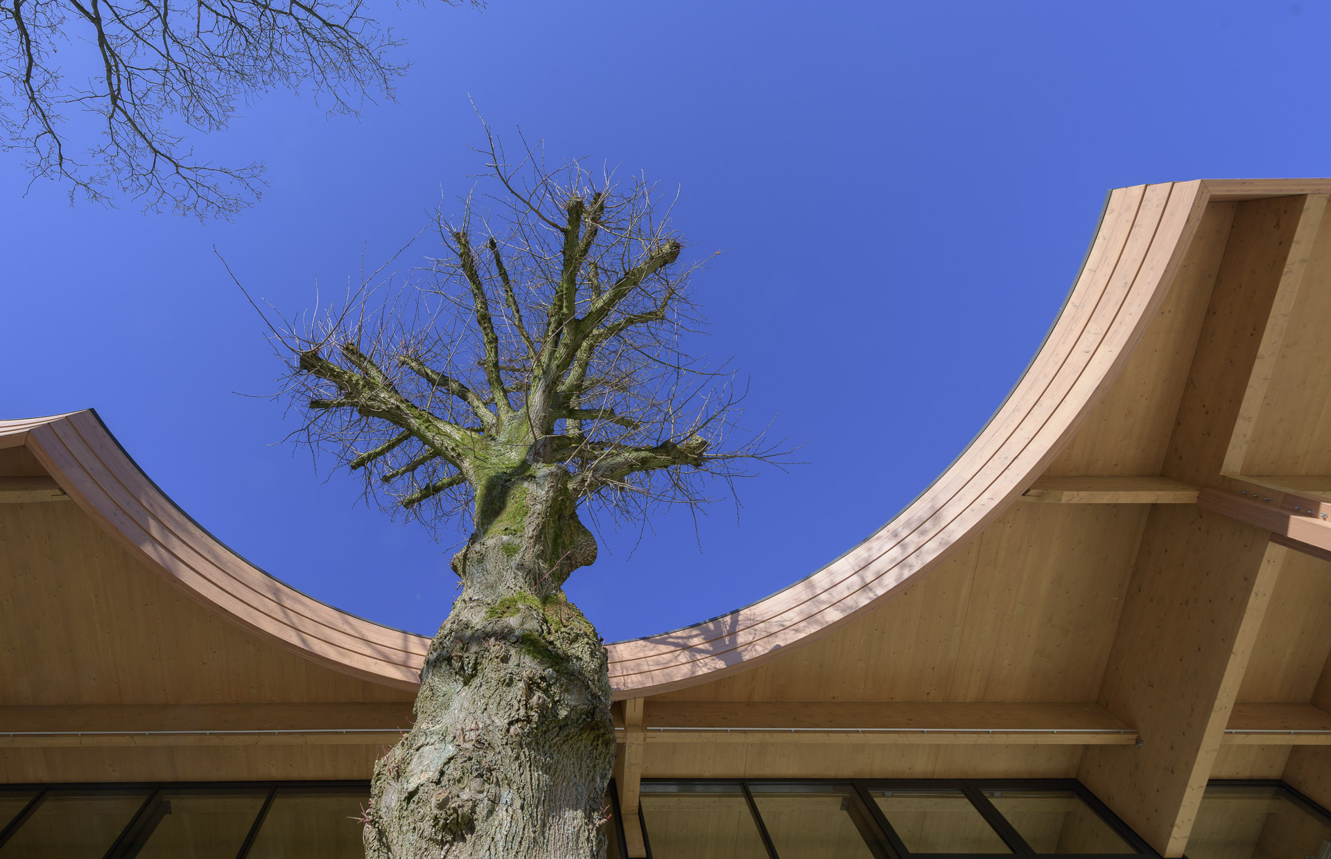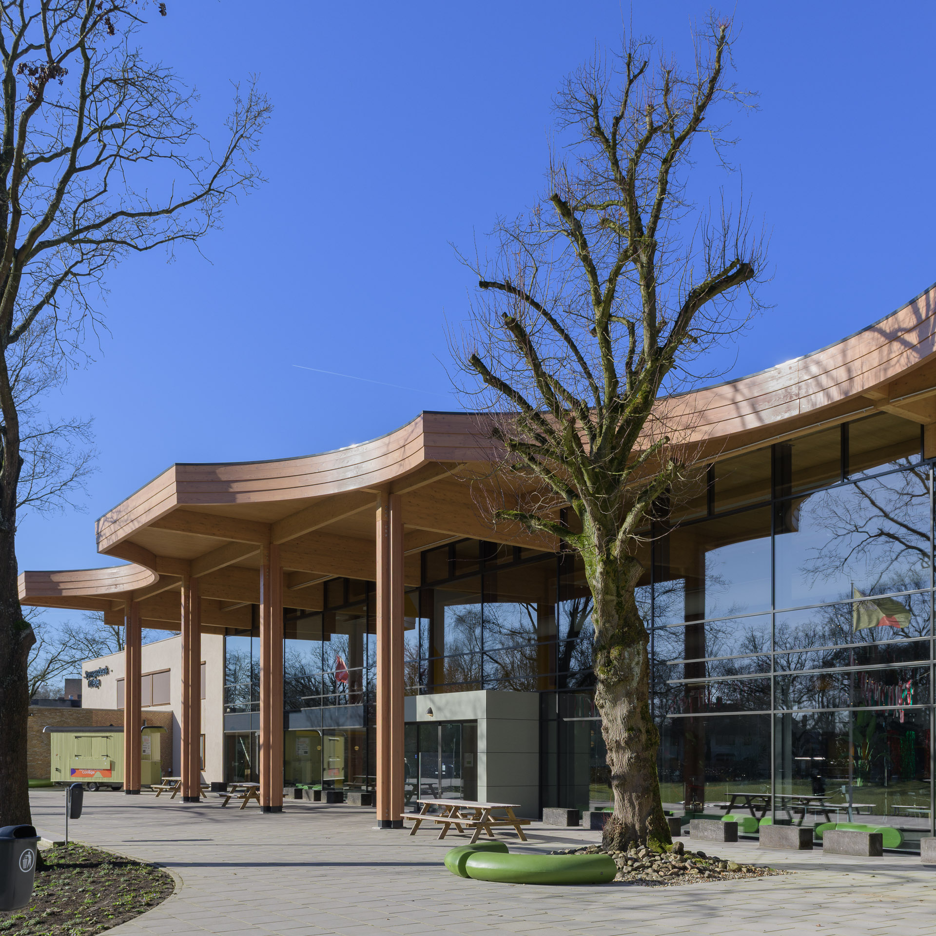 Het gebouw bestaat uit een combinatie van staal- en houtconstructies, met indrukwekkende gelamineerde houten liggers van circa 30 meter. De houten gevel geeft het gebouw een warme, natuurlijke uitstraling. De installatietechniek werd verzorgd door WSi Techniek.